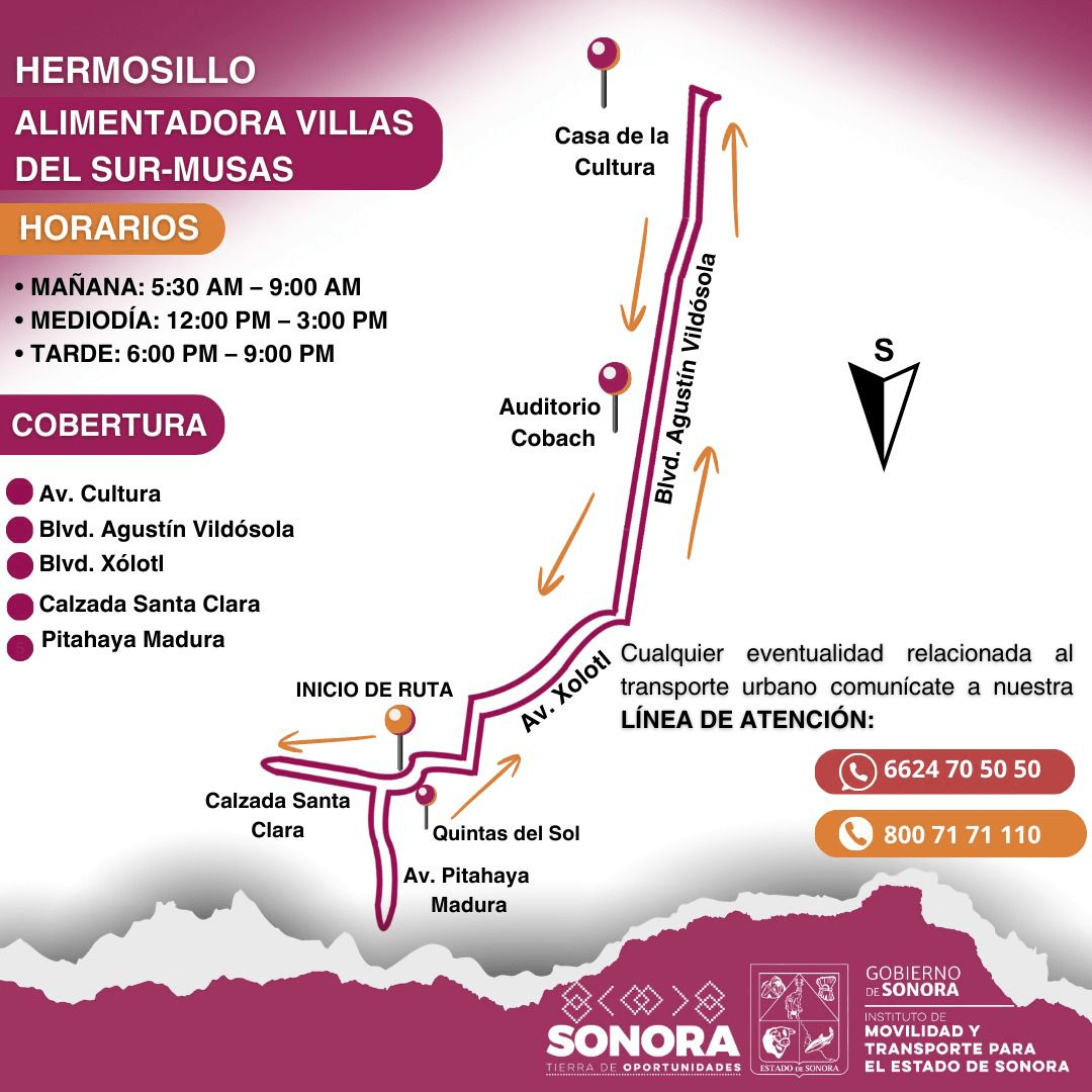 Con el propósito de mejorar la cobertura del servicio de transporte público urbano, el Gobierno de Sonora anuncia la implementación de dos rutas alimentadoras en el norte y sur de Hermosillo, comenzando este lunes primero de septiembre.