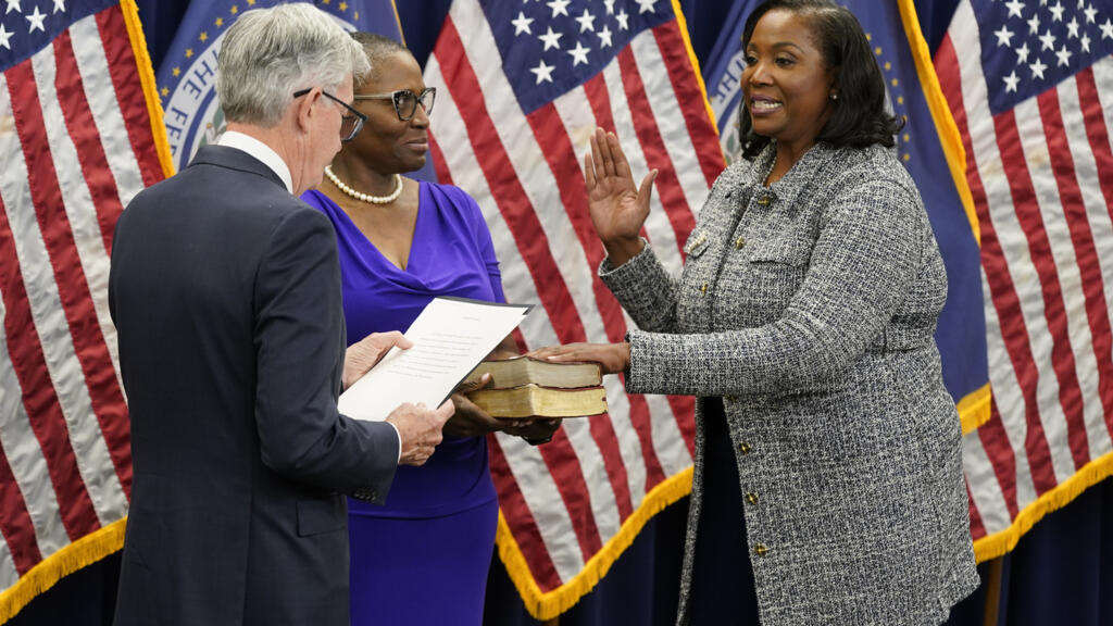 ARCHIVO – Lisa Cook, a la derecha, presta juramento para convertirse en miembro de la Junta de la Reserva Federal, el 23 de mayo de 2022, en Washington. AP – Patrick Semansky