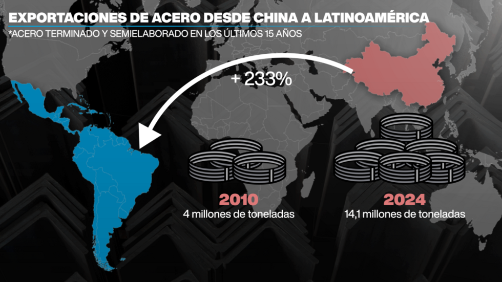 En los últimos 15 años, las exportaciones de acero terminado y semi-elaborado desde China hacia Latinoamérica aumentaron 233%, pasando de alrededor de 4 millones de toneladas en 2010 a 14,1 millones en 2024.