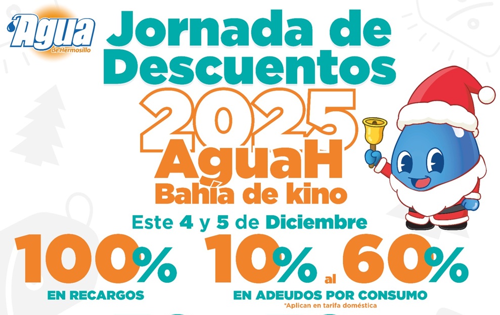Con el objetivo de apoyar la economía familiar y facilitar la regularización de cuentas de consumo de agua, Agua de Hermosillo realiza Jornada de Descuentos 2025 los días 4 y 5 de diciembre en los módulos de Bahía de Kino, Miguel Alemán, San Pedro y La Victoria.