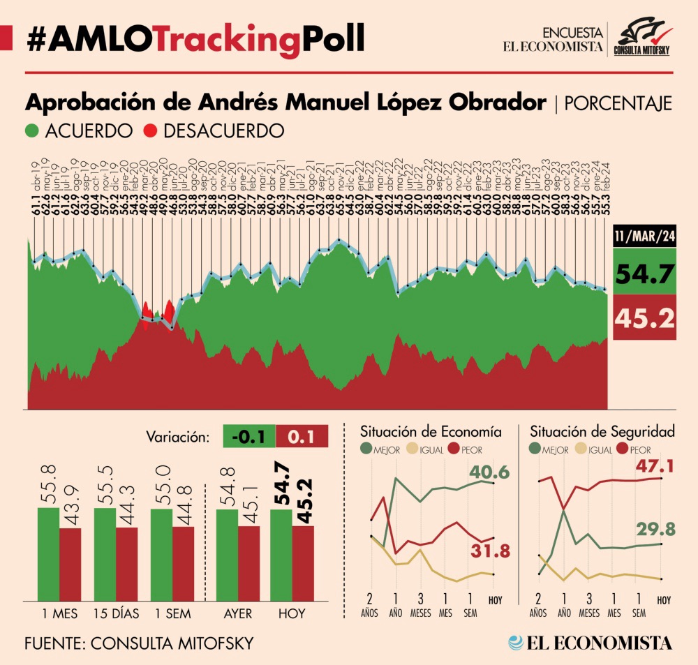 La #AMLOTrackingPoll es un ejercicio estadístico diario sobre la aprobación o desaprobación de la gestión del presidente Andrés Manuel López Obrador, realizado por Consulta Mitofsky de Roy Campos para El Economista.