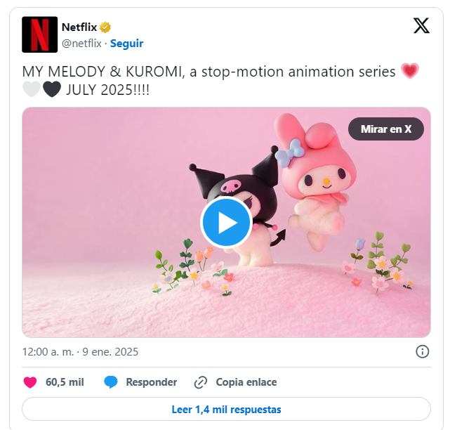 Buenas noticias para los fans de Hello Kitty, quienes deberán mantenerse atentos a la popular plataforma de streaming conocida como Netflix, ya que tiene preparado el estreno de una serie tipo stop – motion, donde las protagonistas serán dos populares conejitas pertenecientes al mundo de amigos de Hello Kitty, llamadas My Melody y Kuromi.