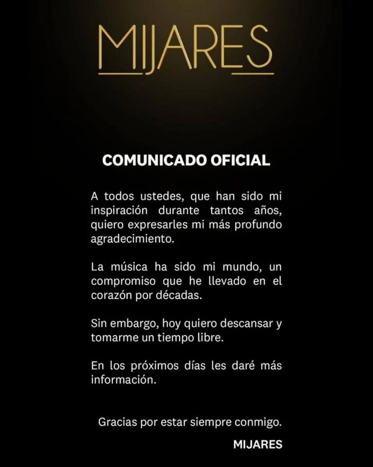 Fue a través de sus redes sociales que el cantante compartió un breve comunicado en el que escribió: «A todos ustedes, que han sido mi inspiración durante tantos años, quiero expresarles mi más profundo agradecimiento (…) La música ha sido mi mundo, un compromiso que he llevado en el corazón por décadas. Sin embargo, hoy quiero descansar y tomarme un tiempo libre. En los próximos días les daré más información. Gracias por estar siempre conmigo».