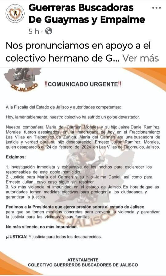 “Nos pronunciamos en apoyo al colectivo hermano de Guerreros Buscadores de Jalisco por el atroz asesinato de la compañera María del Carmen y su hijo Jaime Daniel. Lamentamos profundamente que sean víctimas de la falta de seguridad del Estado Mexicano, solo por salir a buscar a su familiar desaparecido”, expresó el grupo sonorense.