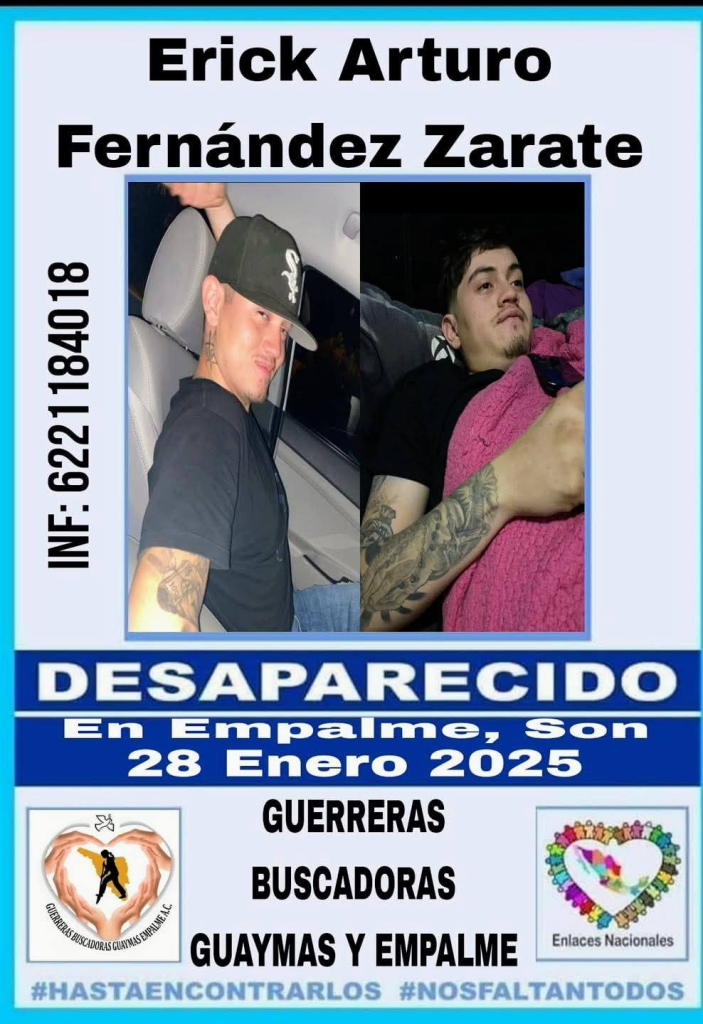 Empalme, Sonora.- El colectivo Guerreras Buscadoras de Guaymas y Empalme A.C. emitió una ficha de búsqueda para dar con el paradero de Erick Arturo Fernández Zárate, reportado como desaparecido el pasado 28 de enero de 2025, en el municipio de Empalme, Sonora.