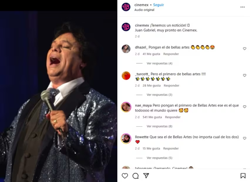 La noticia fue dada a conocer a través de las redes sociales de Cinemex, complejo que llevará al Divo Juárez a la pantalla grande: «¡Tenemos un notición!Juan Gabriel, muy pronto en Cinemex», escribieron junto a un breve video del cantante.