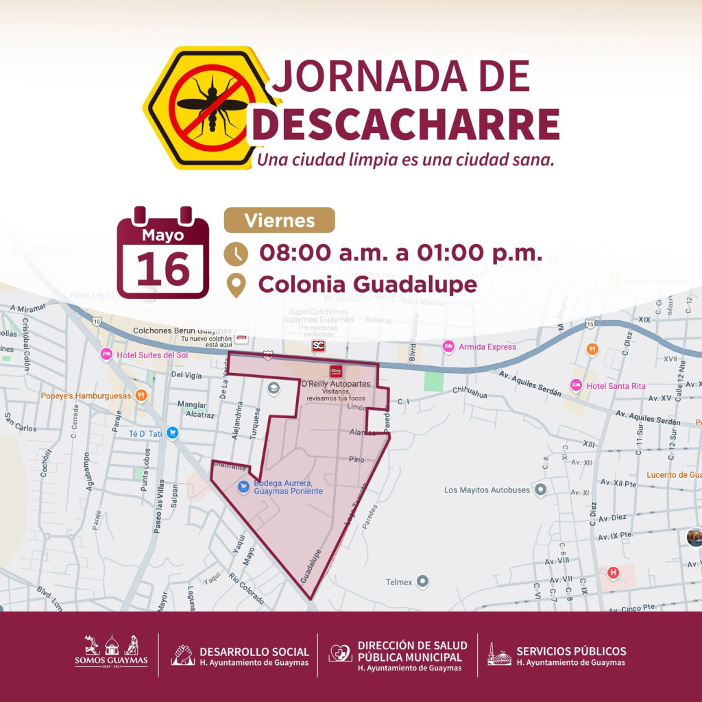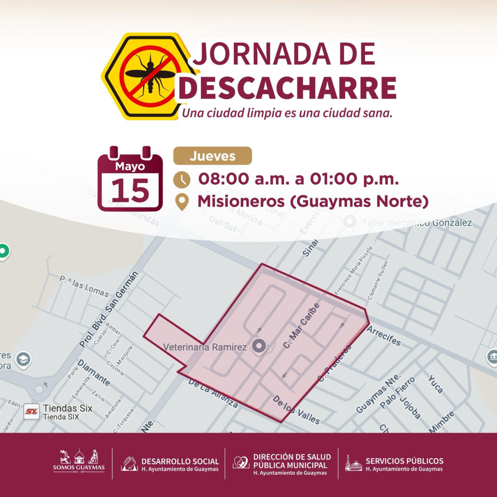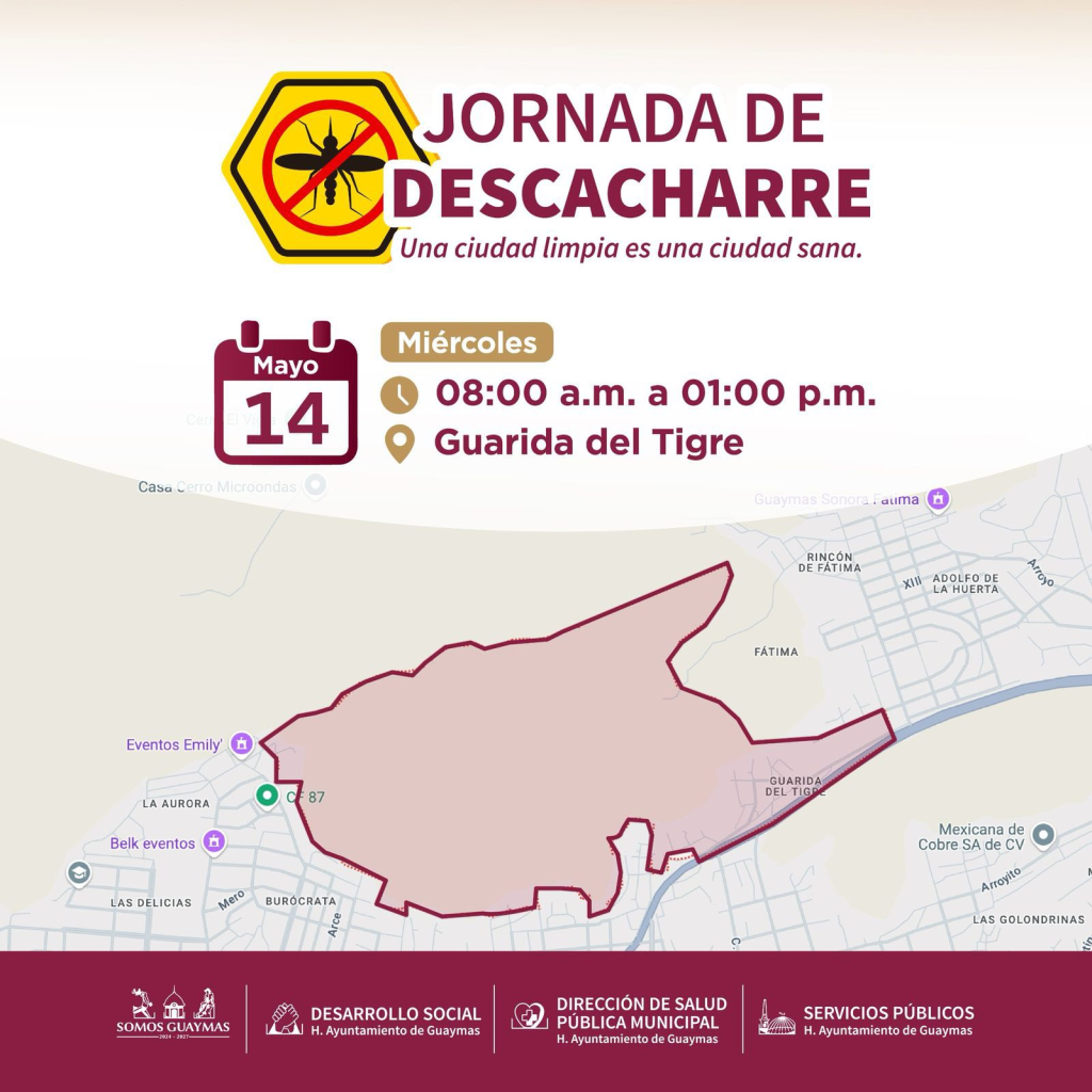 Guaymas, Sonora, 12 de mayo de 2025.- Del 14 al 16 de mayo las colonias Guarida del Tigre, Misioneros y Guadalupe, tendrán actividad para la prevención del dengue, zika y chikungunya a través de la Jornada de Descacharre.