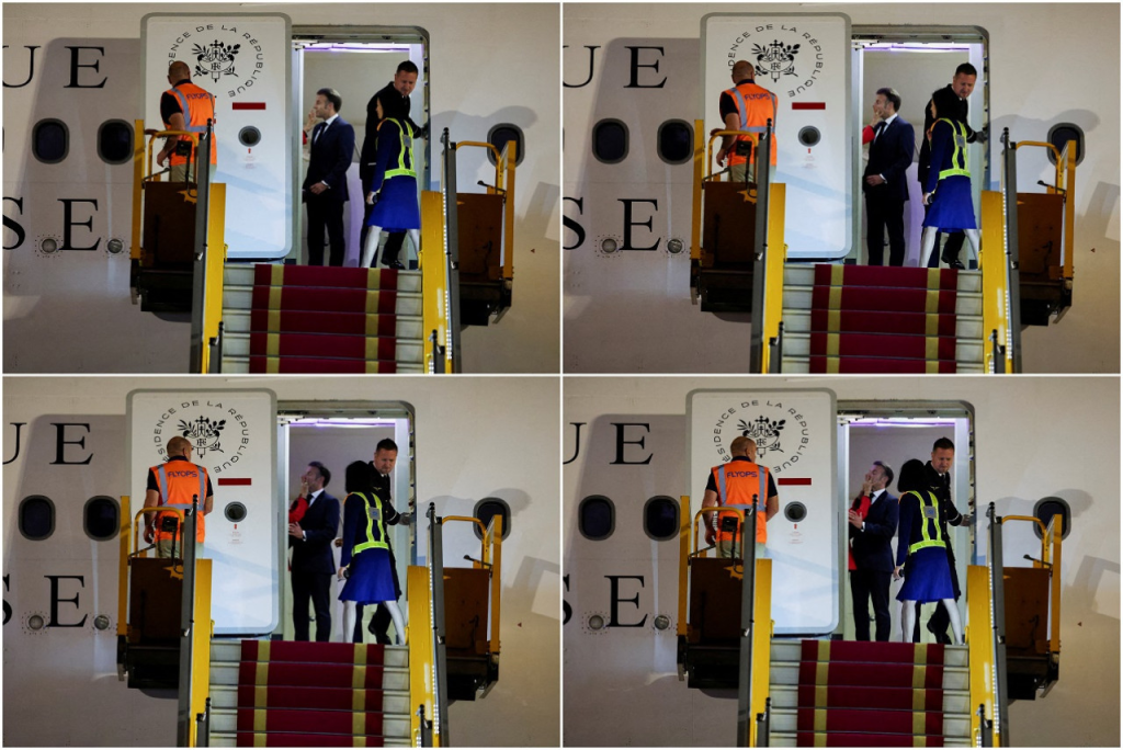 El mandatario francés da un cuarto de giro por el empujón de la mano de su mujer, se da cuenta entonces de que la puerta está abierta y de que lo que ocurrió se ha visto desde el exterior de la aeronave, por lo que lanza un saludo con una sonrisa.