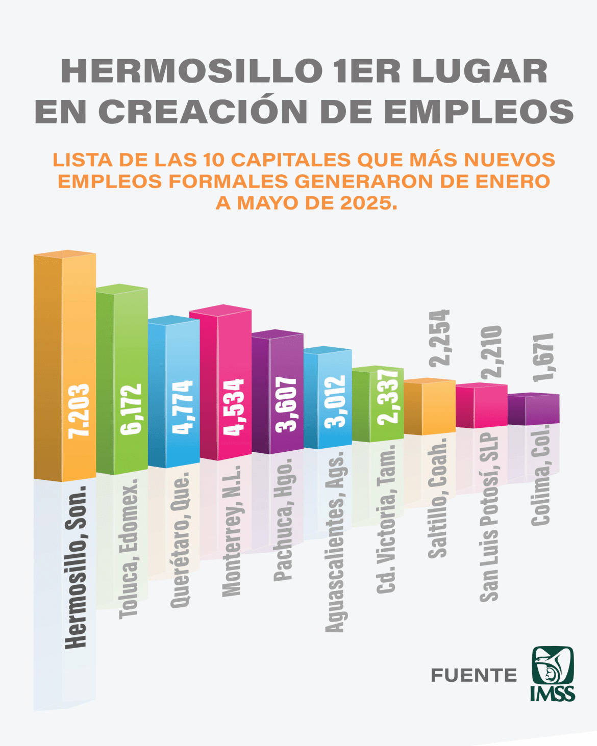 Hermosillo lidera lista de las diez capitales con mayor generación de empleos, según el IMSS