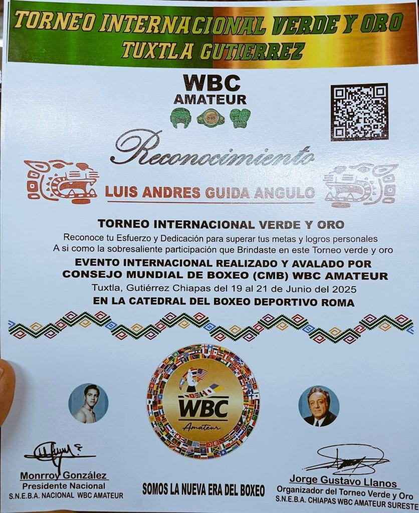Tuxtla Gutiérrez, Chiapas; 25 de junio de 2025.- El guaymense Luis Andrés Güida Angulo logró una destacada participación en el Torneo Internacional Verde y Oro, avalado por el Consejo Mundial de Boxeo (WBC) en su rama amateur, al conquistar la medalla de bronce en la categoría peso wélter (66 kg) y asegurar su pase al Campeonato Mundial a celebrarse en octubre en Tijuana.