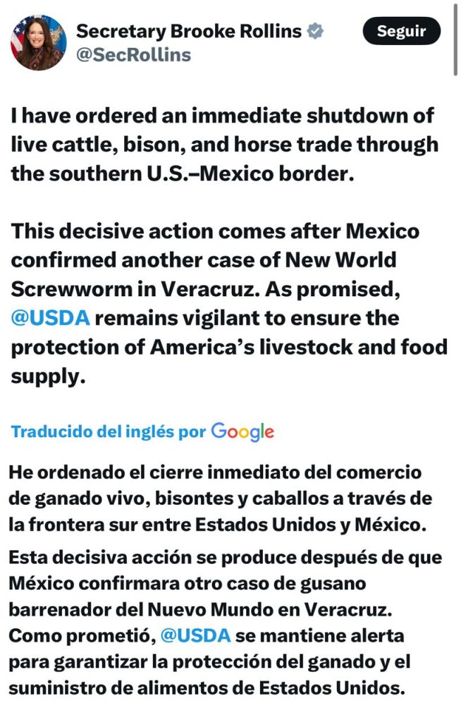 El gobierno de Estados Unidos ordenó el cierre inmediato del comercio transfronterizo de ganado vivo, bisontes y caballos con México, luego de confirmarse un nuevo caso de gusano barrenador en el estado de Veracruz.