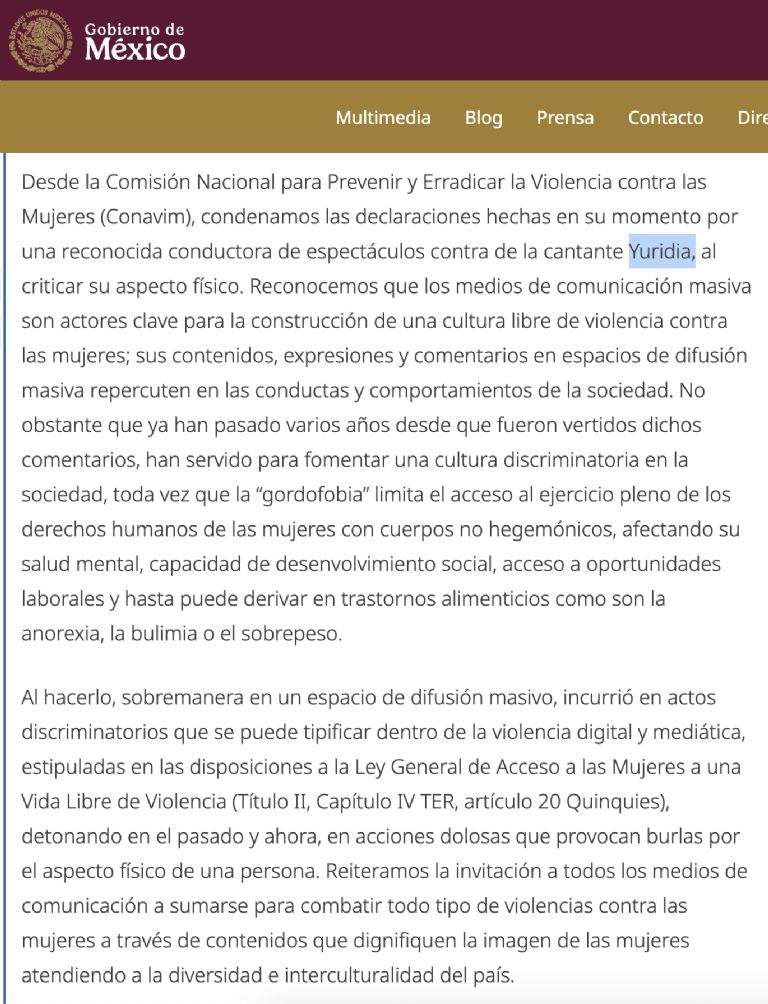 Lo anterior se volvió una situación complicada para la misma Chapoy y el resto de integrantes de Ventaneando, pues, la instancia gubernamental Conavim condenó las críticas respecto al aspecto físico de la ex alumna de La Academia.
